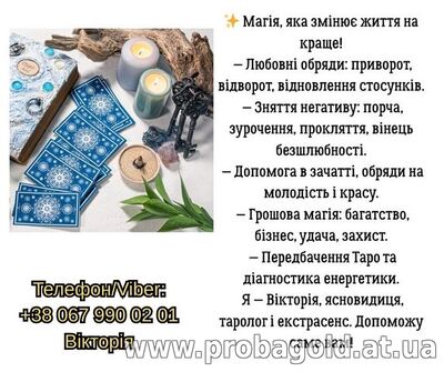Шукаєте допомогу ясновидиці, екстрасенса, рунолога і таролога? Мене звати Вікторія, і я працюю з людьми, допомагаючи змінювати їхню долю за допомогою стародавніх знань, ритуалів і магії. Я відчуваю