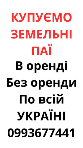 Купуємо ЗЕМЕЛЬНІ ПАЇ по всій Україні!!! - Найкраща ціна по ринку - В оренді - Без оренди - Наше оформлення - Юридичний супровід Для консультації з приводу продажу вашого паю дзвоніть за номером або пишіть у вай